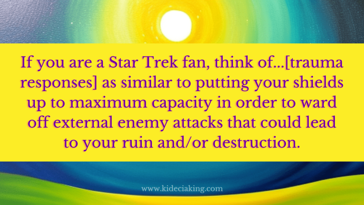 When you experience Trauma, the danger and extreme stress that you faced that contributed to it (and or the threat of new and other dangers), you feel, is still lurking, waiting in the shadows to attack you, like the Ferengi (more Star Trek reference), poised to stir up some trouble at any time instead of peacefully existing in your shared galaxy. After all, you may think, “an attack could happen again.” Didn’t the first “torpedo,” the second torpedo, and then the fires that it created, not just come into your life in the blink of an eye, or last for a long period of time? One day you were going about your day coursing curiously through space and time, and then, in a moment, you were under direct threat or attack.